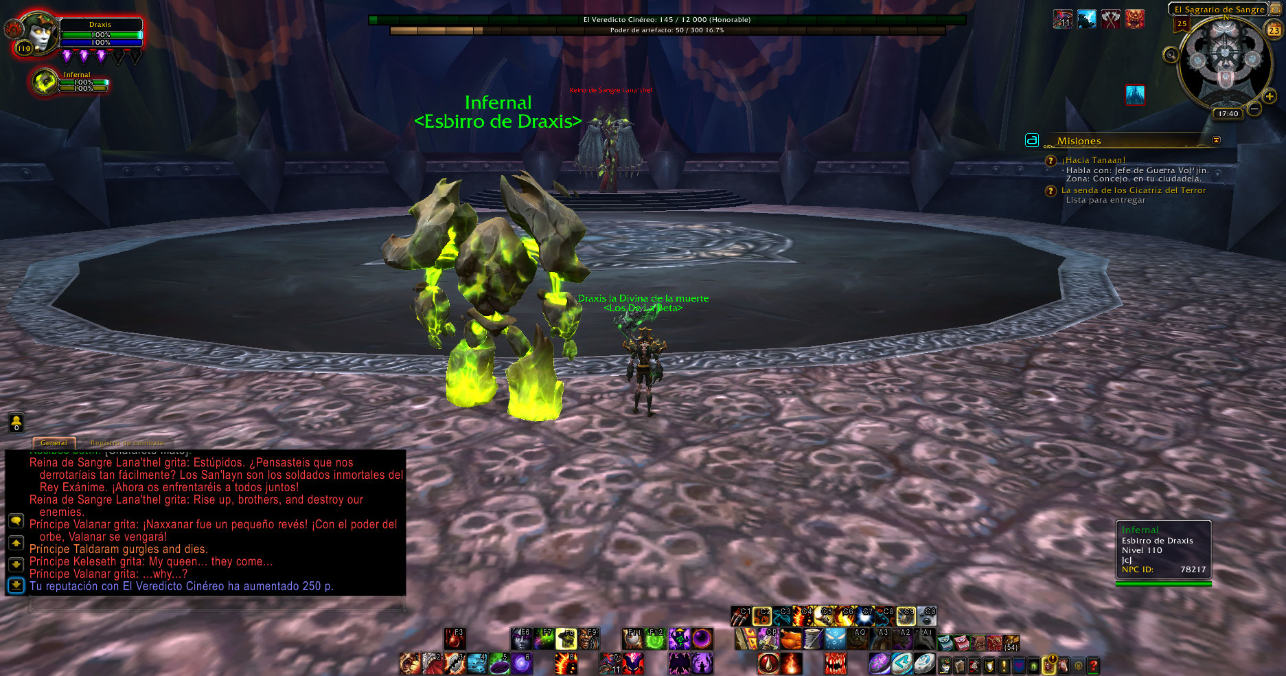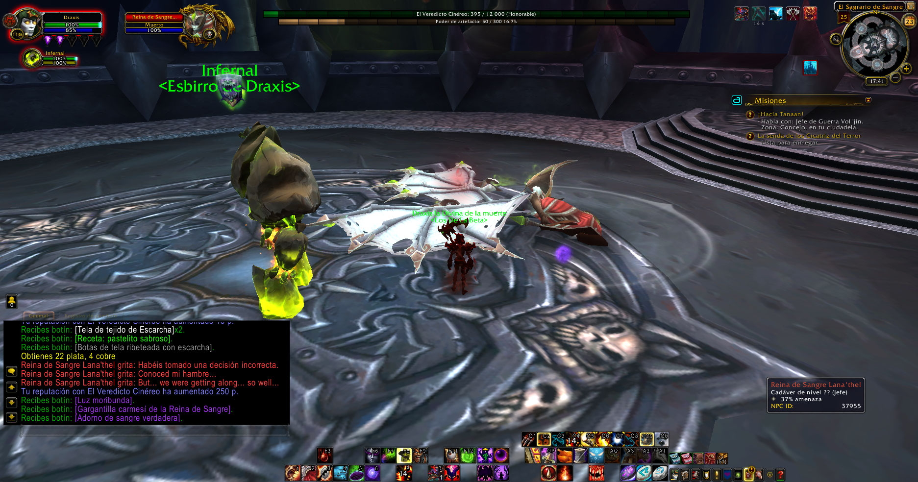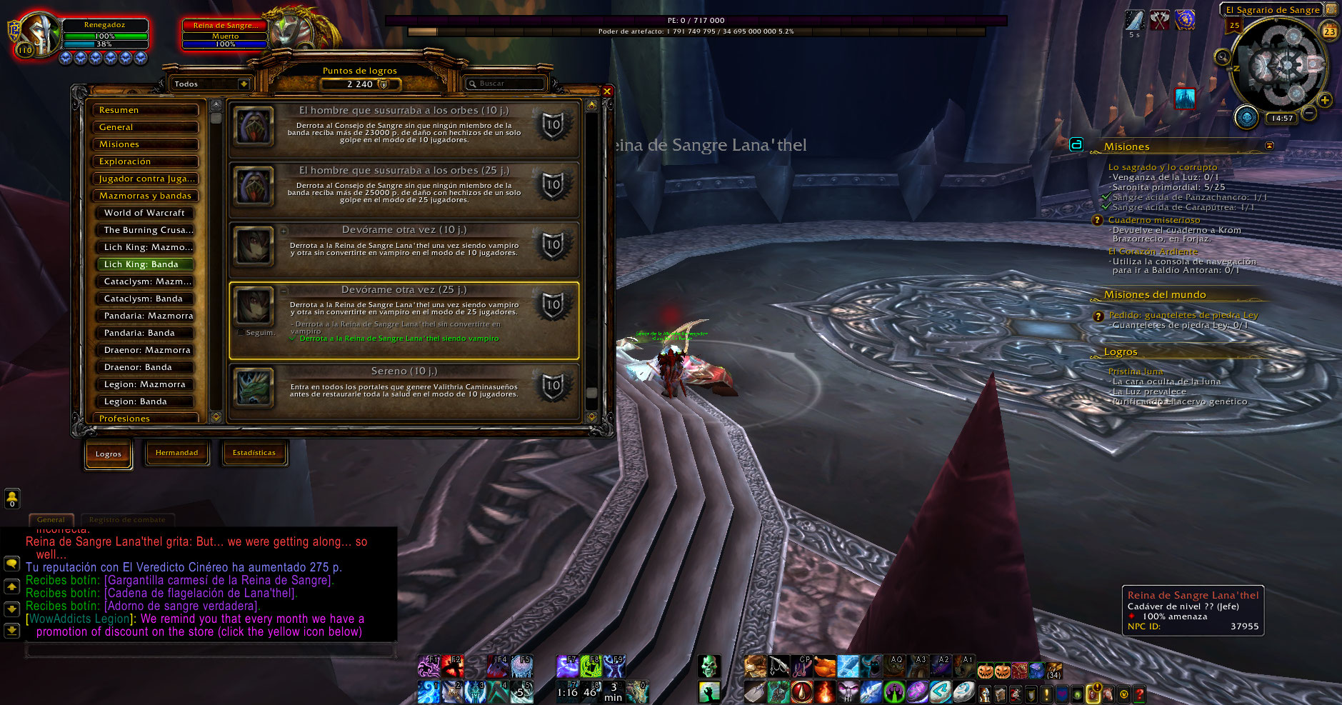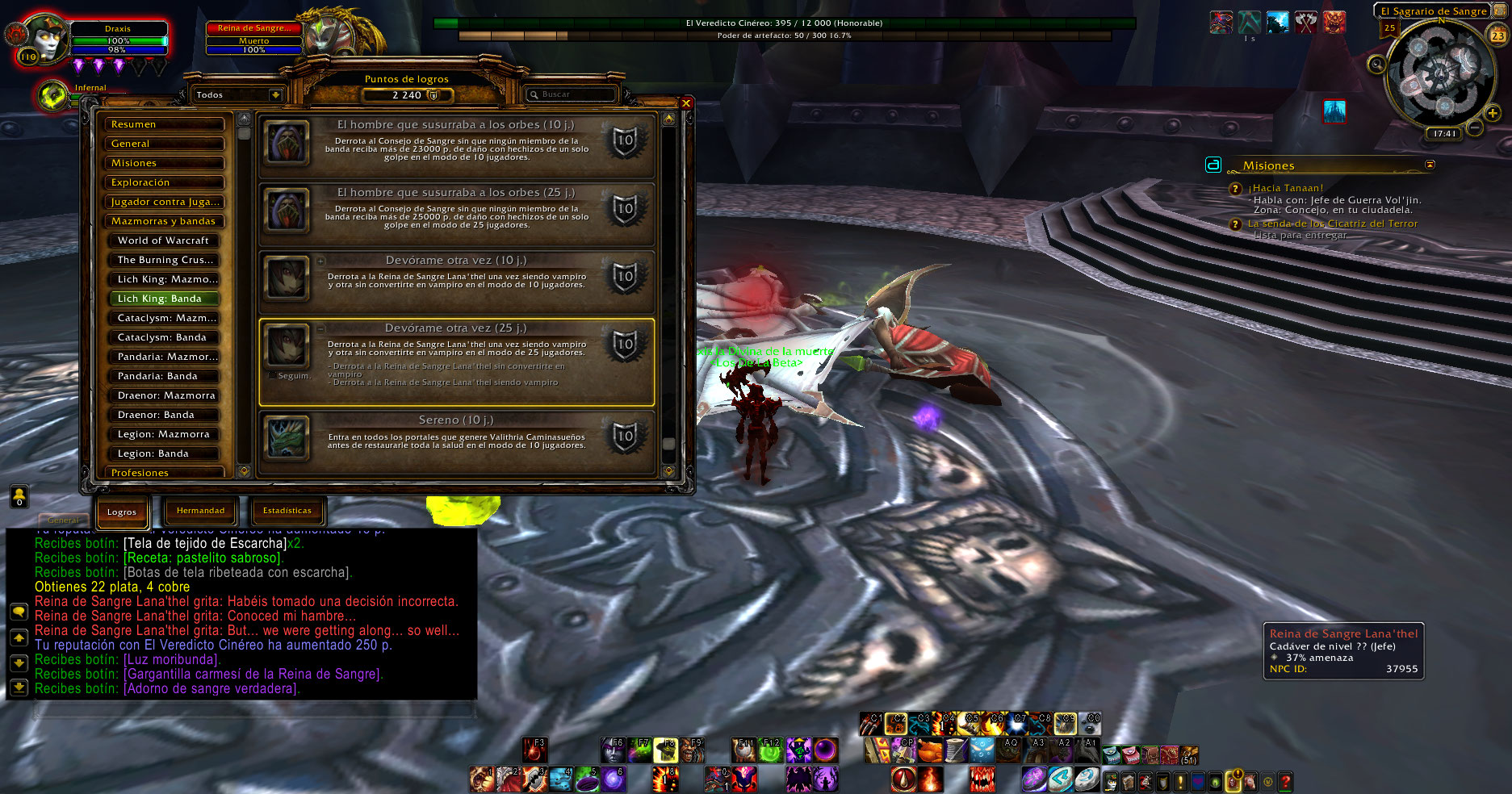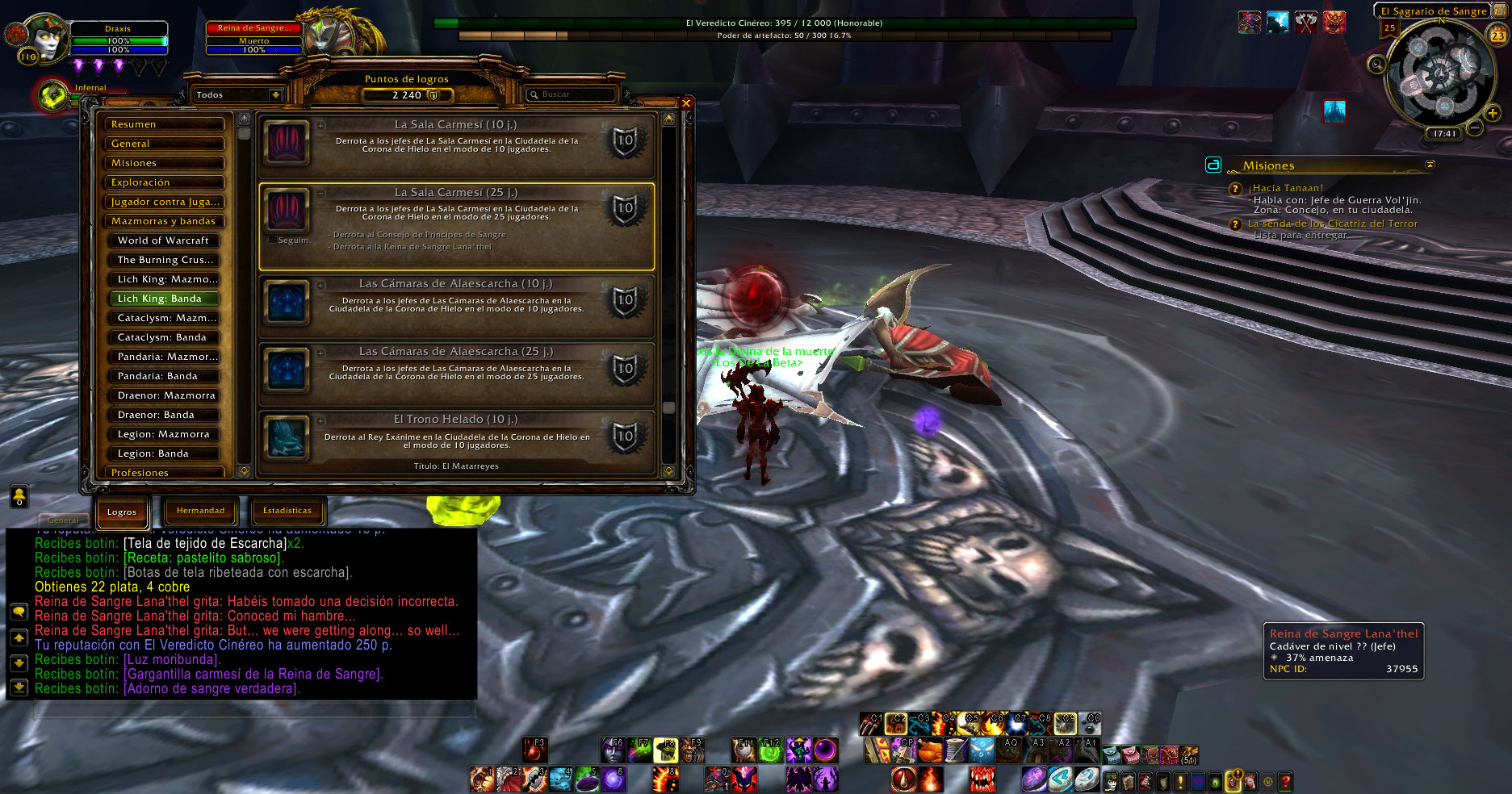 El boss Blood-Queen Lana'thel tiene algunos textos en español e ingles, al matarla no marca el logro Once Bitten, Twice Shy pese a que muere sin morder al pj, con mi DK le mordio hace tiempo y ahora no lo mordio y con mi bruja no esta marcado parte de ese lobro, aparte no se marca para el logro The Crimson Hall.
