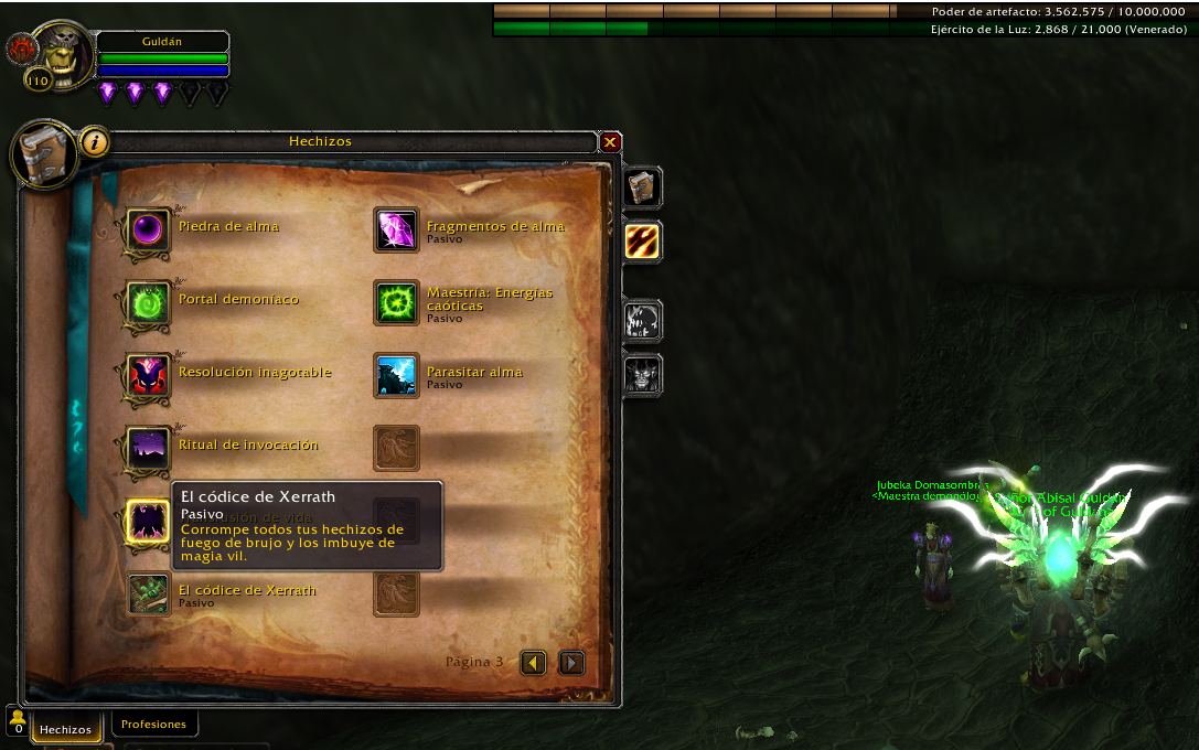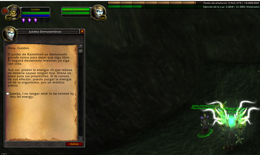 Le saludo el Brujo Guldán y el motivo del presente mensaje es a fin de poder reportar que no se aplica el cambio del fuego verde del brujo una vez completado toda la quest, siendo que dentro de mi pasivos de hechizos tengo [El códice de Xerrath] que corrobora el cambio de color de mis hechizos a color verde pero no se aplica. Tengo que indicar que intentado borrar cache y relogear pero no surte efecto. Por otro lado haciendo la indagaciones correspondientes he averiguado que en la zona de valle Sombraluna ubicado en terrallende hay un npc de nombre Jubekka Domasom que se activa una vez que hallas completado la cadena de quest y esta misma permite quitar o aplicar el fuego verde para ello pide 500 de oro y al momento de utilizarlo no aplica cambio alguno. Por lo que solicito ayuda para que se pueda aplicar correctamente el cambio de fuego rojo a verde. Saludos Cordiales. Se adjunta foto del mismo.
