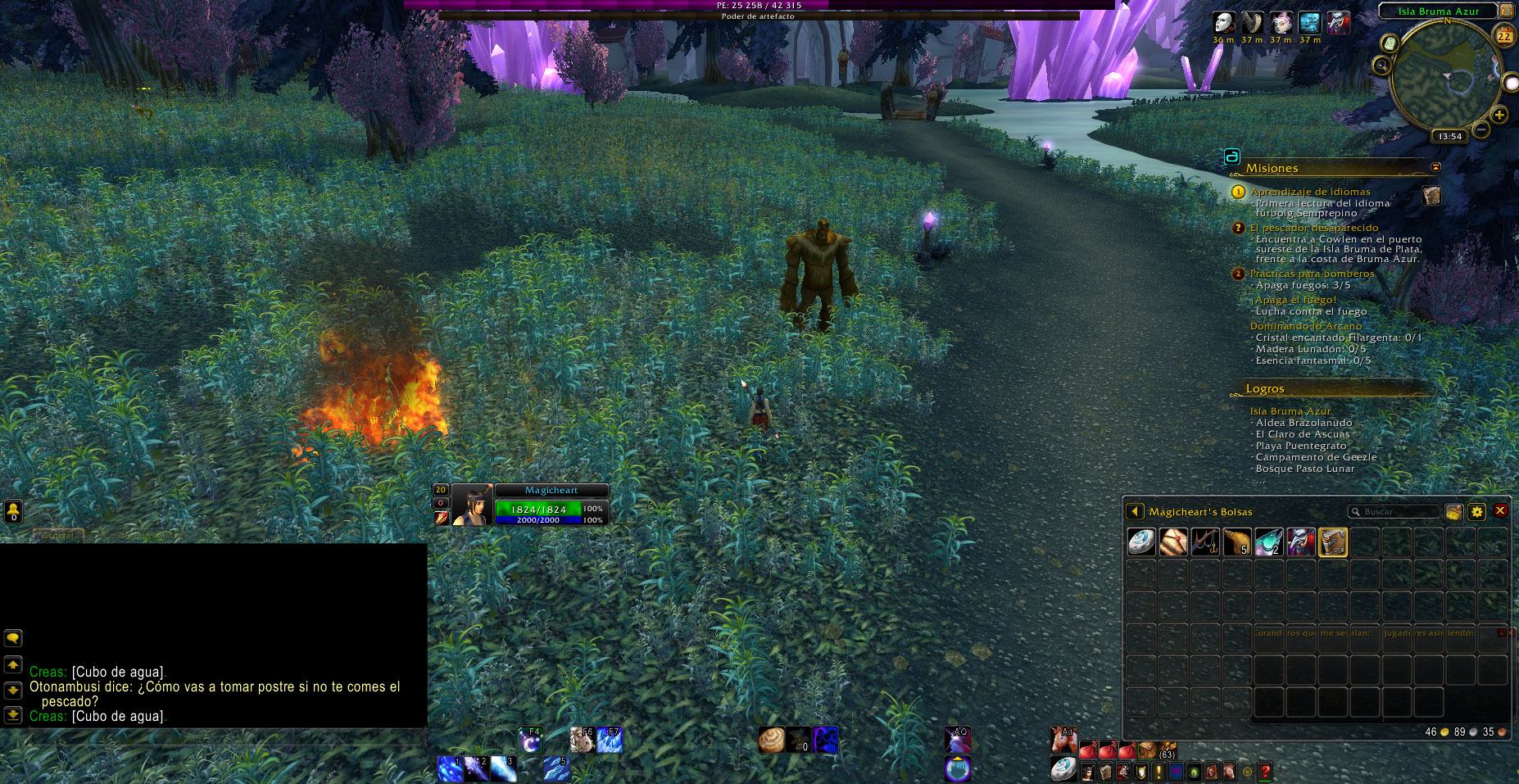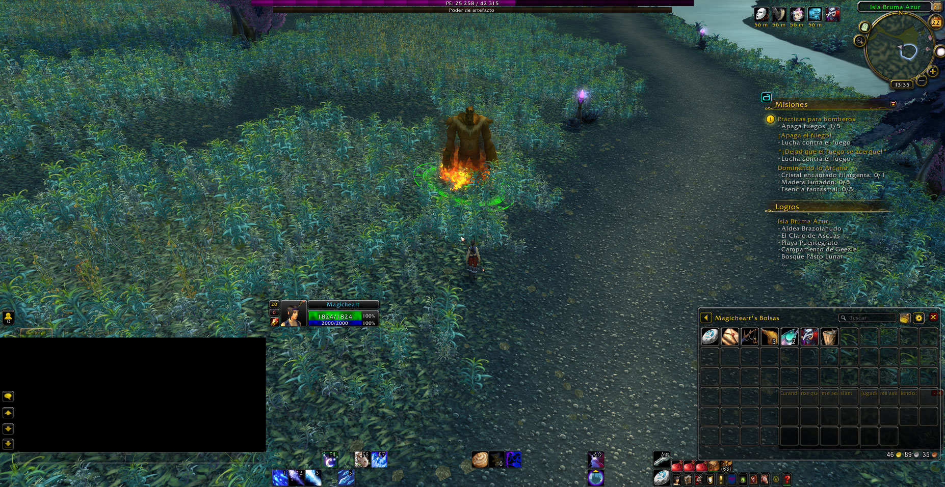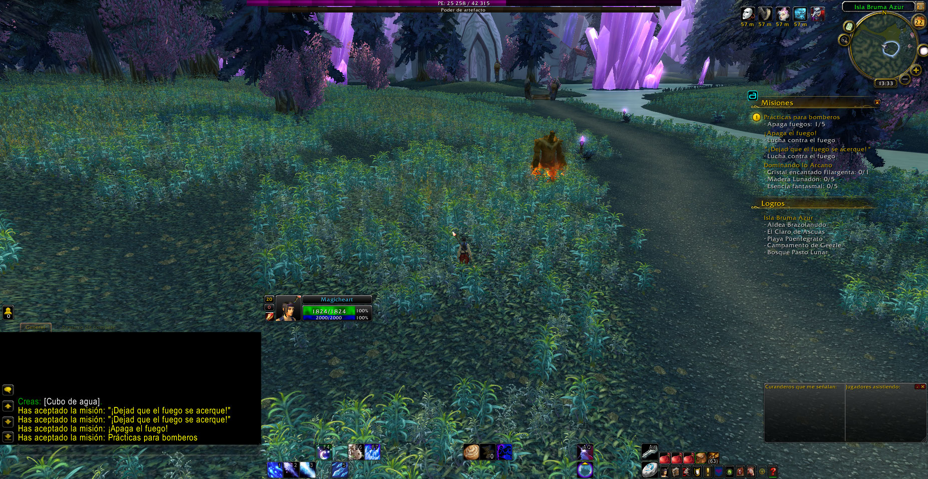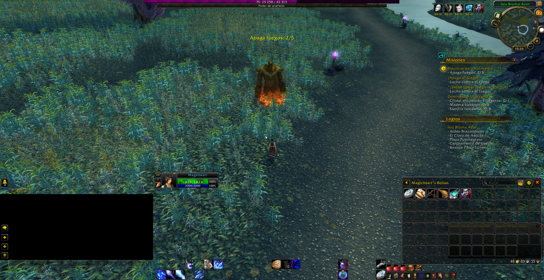 Faltan 3 objetivos para completar de una vez la misión, solo se ven dos y se debe esperar a que el fuego aparezca de nuevo para avanzar la quest, adjunto un enlace a video donde se ve como es el desarrollo de la quest, aunque es de otra zona.