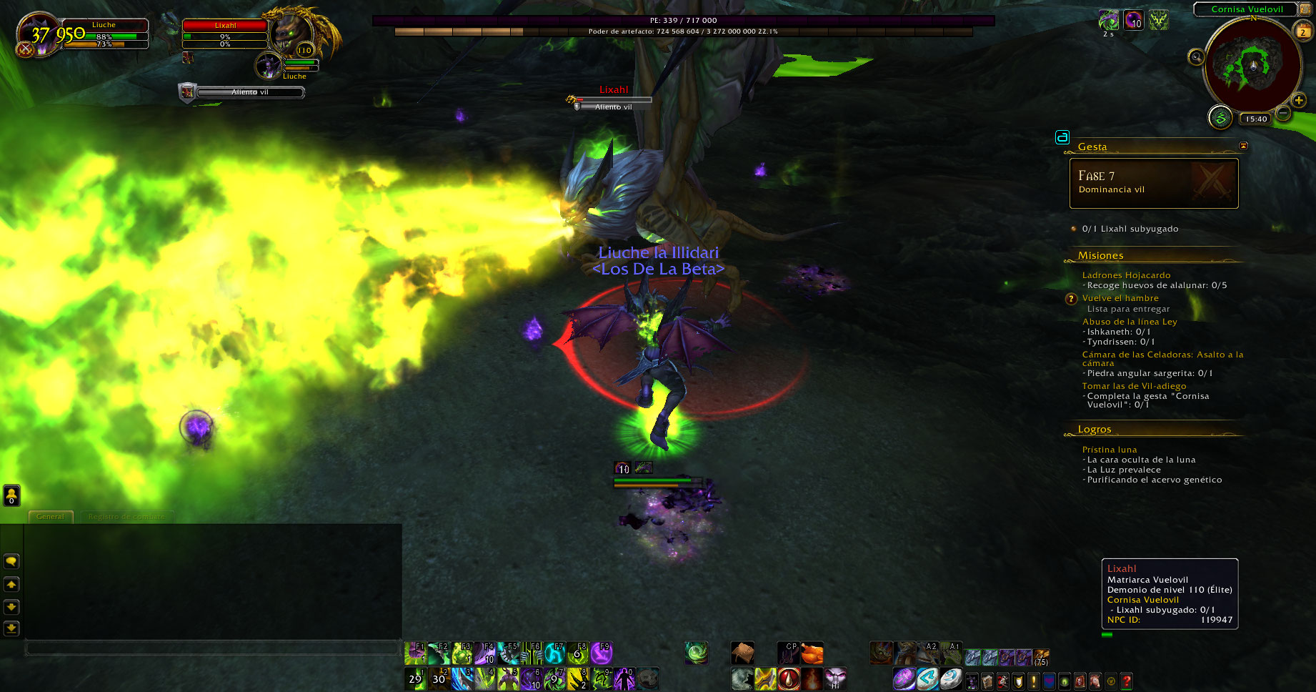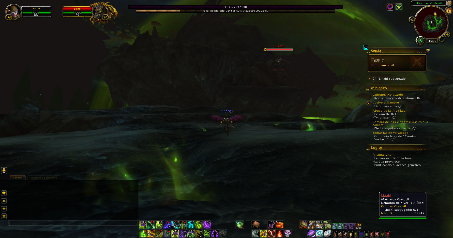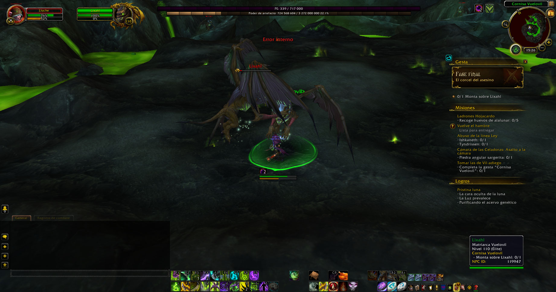 El jugador al aparecer en la zona de enfrentamiento permanece como planeando todo el tiempo, el NPC Lixahl a vencer aparece con toda su vida cuando debería aparecer con menos y este NPC no desaparece al vencerlo, me sale una frase que dice "Error interno" al querer montar al Lixahl que aparece y otra que dice "No puedes moverte" al intentar ir a otro lugar ya que el NPC Lixahl sigue atacando y hace daño, hice el enfrentamiento dos veces pensando posiblemente fuera un bug momentaneo y paso lo mismo, adjunto un enlace donde se ve el enfrentamiento.