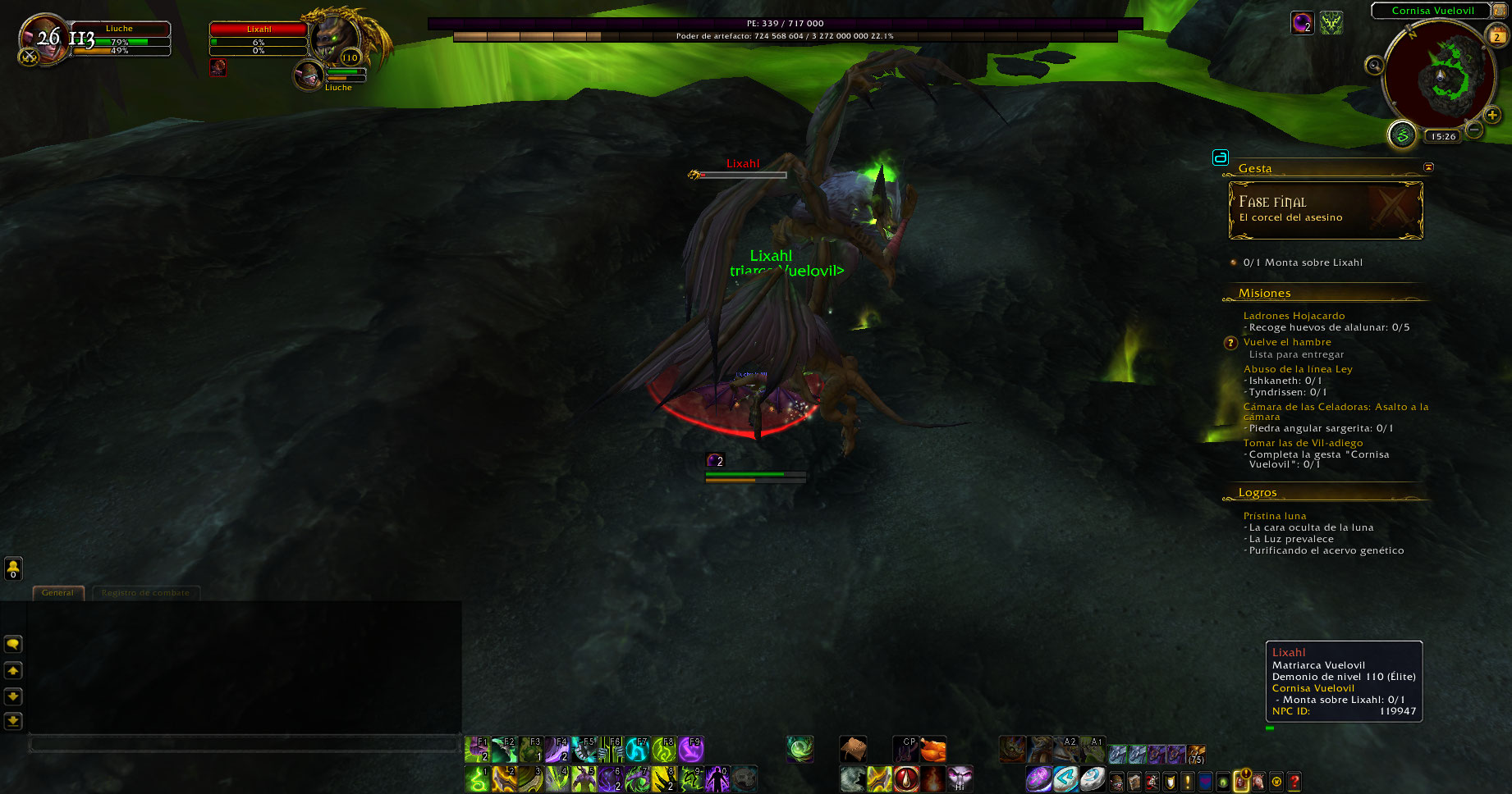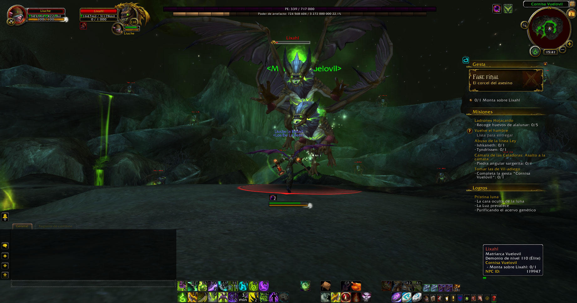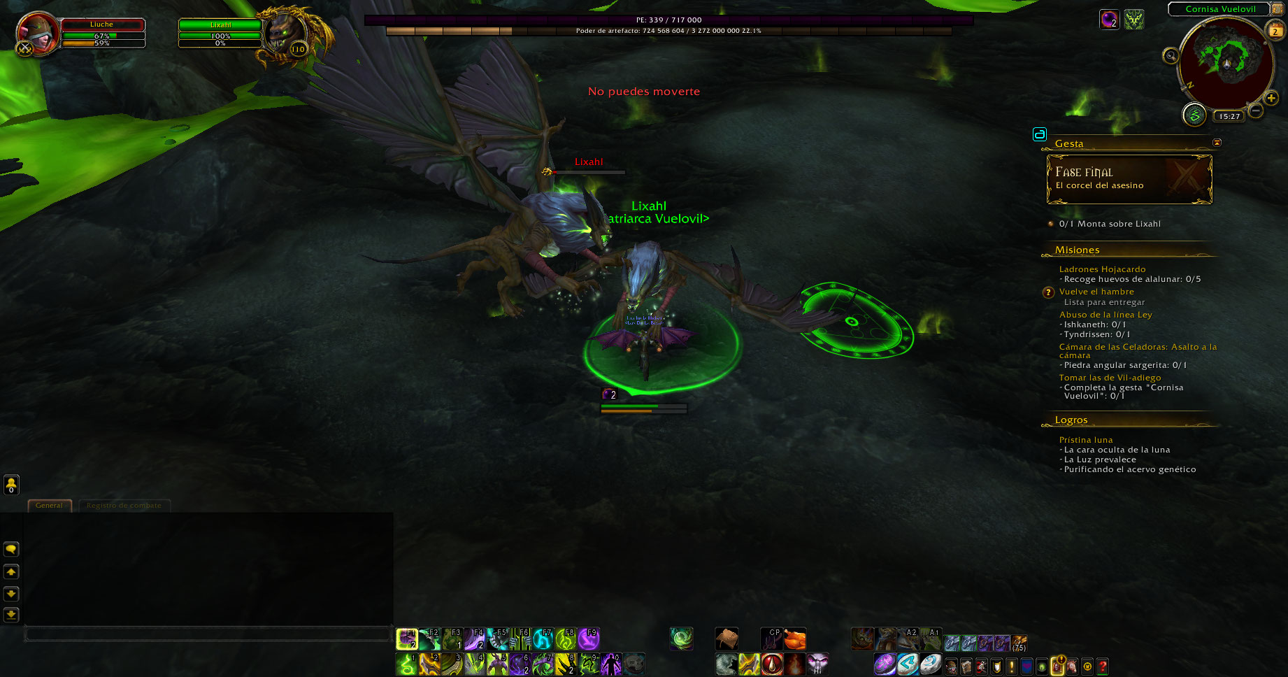El jugador al aparecer en la zona de enfrentamiento permanece como planeando todo el tiempo, el NPC Lixahl a vencer aparece con toda su vida cuando debería aparecer con menos y este NPC no desaparece al vencerlo, me sale una frase que dice "Error interno" al querer montar al Lixahl que aparece y otra que dice "No puedes moverte" al intentar ir a otro lugar ya que el NPC Lixahl sigue atacando y hace daño, hice el enfrentamiento dos veces pensando posiblemente fuera un bug momentaneo y paso lo mismo, adjunto un enlace donde se ve el enfrentamiento.