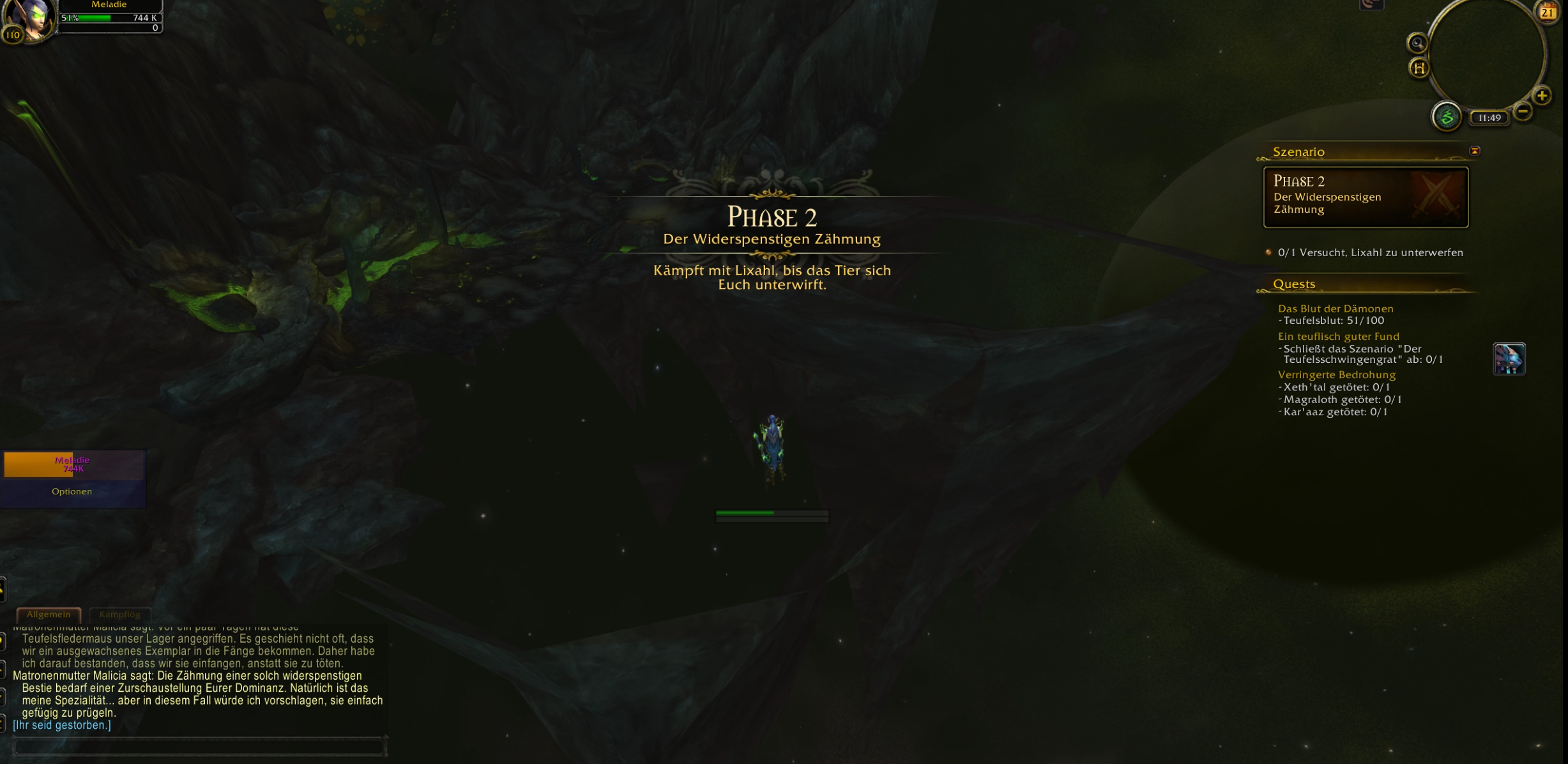 During the 'Felwing Ledge' scenario for the Demon Hunter class mount quest, I encounter a critical bug in Phase 6. After jumping and gliding onto Lixahl and mounting the creature, the camera lowers as expected, but upon reaching the destination, my character is thrown off. This causes my character to instantly die. I cannot release spirit or respawn, and the only way to exit is by force-quitting the game via Alt+F4. When I log back in, I appear at my hearthstone location in Orgrimmar, and the scenario resets. This results in an endless loop where I cannot progress the quest.